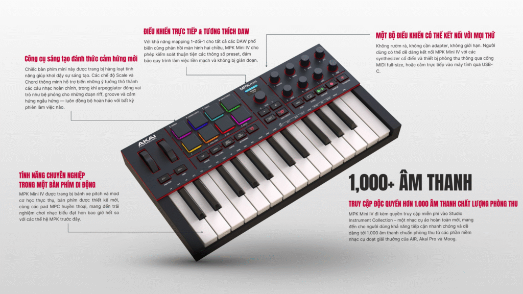 Với kết nối USB-C, cổng MIDI full-size, cùng khả năng tích hợp plug-and-play với các DAW phổ biến (Ableton Live, Logic Pro, FL Studio, Bitwig, và Cubase), MPK Mini IV là người bạn đồng hành linh hoạt trong phòng thu cho thế hệ sáng tạo tiếp theo.
