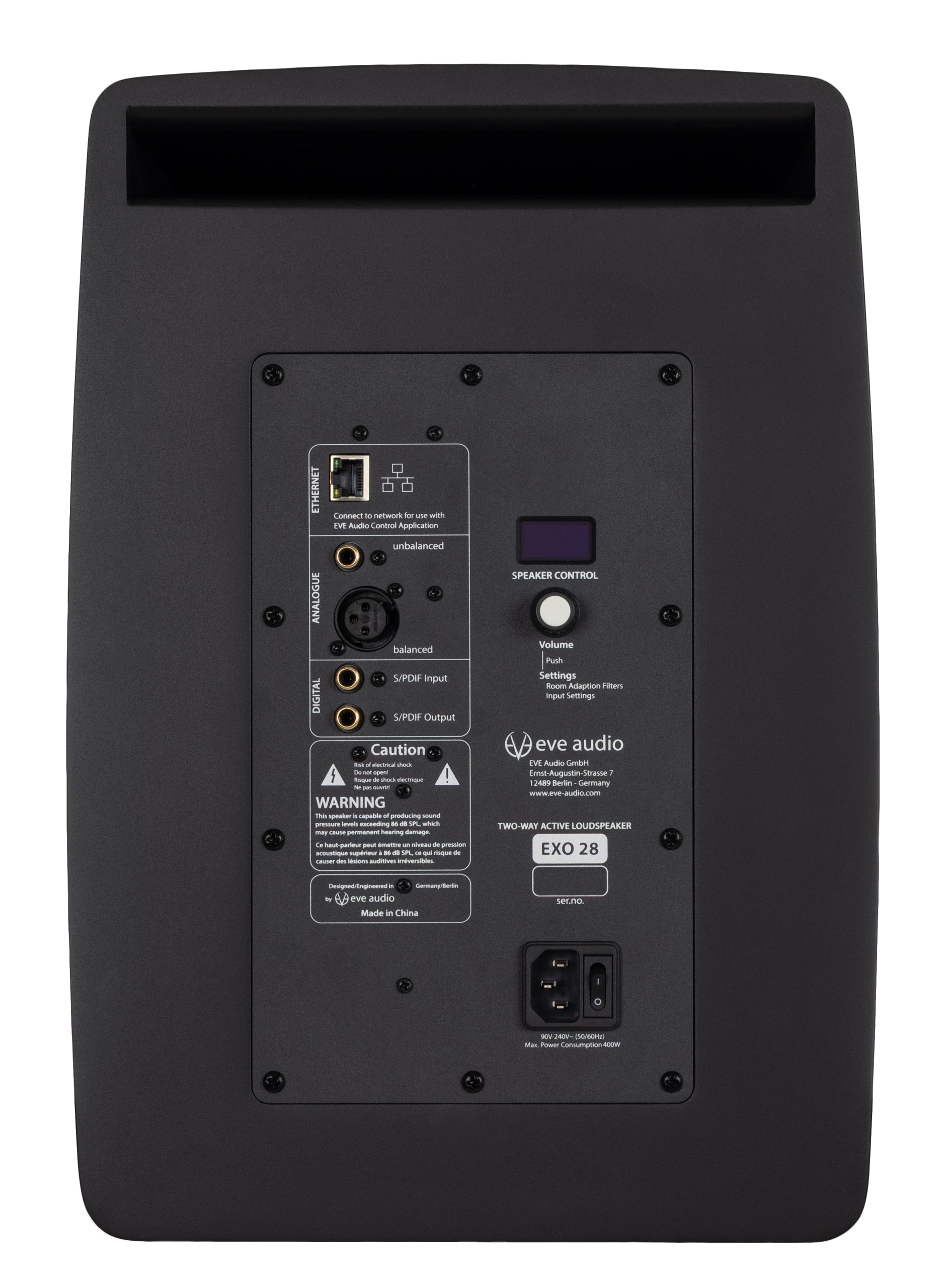 - Logo “eve audio” phía trước phát sáng (có thể chỉnh độ sáng 0-100%), kiêm đèn báo trạng thái (quá tải, cập nhật firmware…).